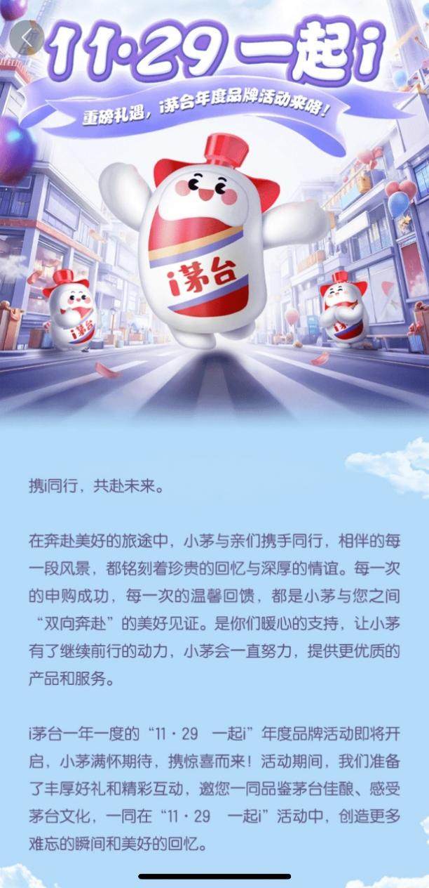 一直以来,丰富多彩的活动、价值千万的福利以及多项重磅权益都是i茅台“11·29”年度品牌活动的“亮点”。这不仅是对核心用户的感恩回馈,更拓宽了平台与消费者的对话渠道,在丰富用户权益的同时,植入优质的产品、厚重的文化、贴心的服务,为消费者创造新体验,为茅台品牌叙事提供了更多新的可能。