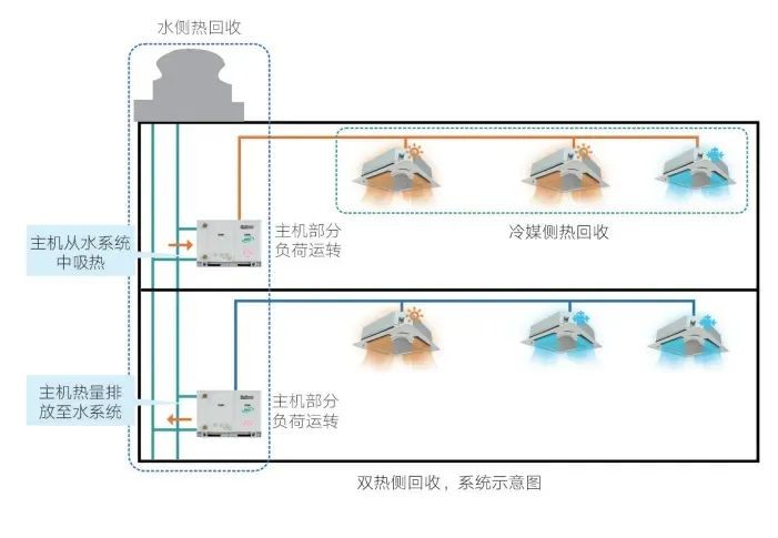 水冷多联应用较为分散,同一个水循环系统中,不同主机之间可同时进行制冷制热,运行制冷模式的机组向水系统中排放热量,而运行制热模式的机组从水系统中吸收热量,制冷与制热的主机可通过水系统实现热回收,提高能源利用率。此外,mds-w采用三管制设计,通过冷热切换装置,实现冷媒侧的废热回收,进一步提高系统能效。