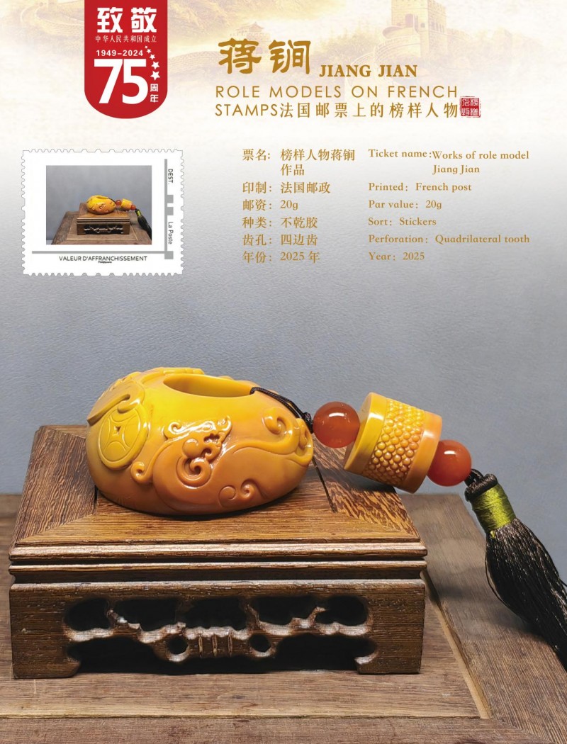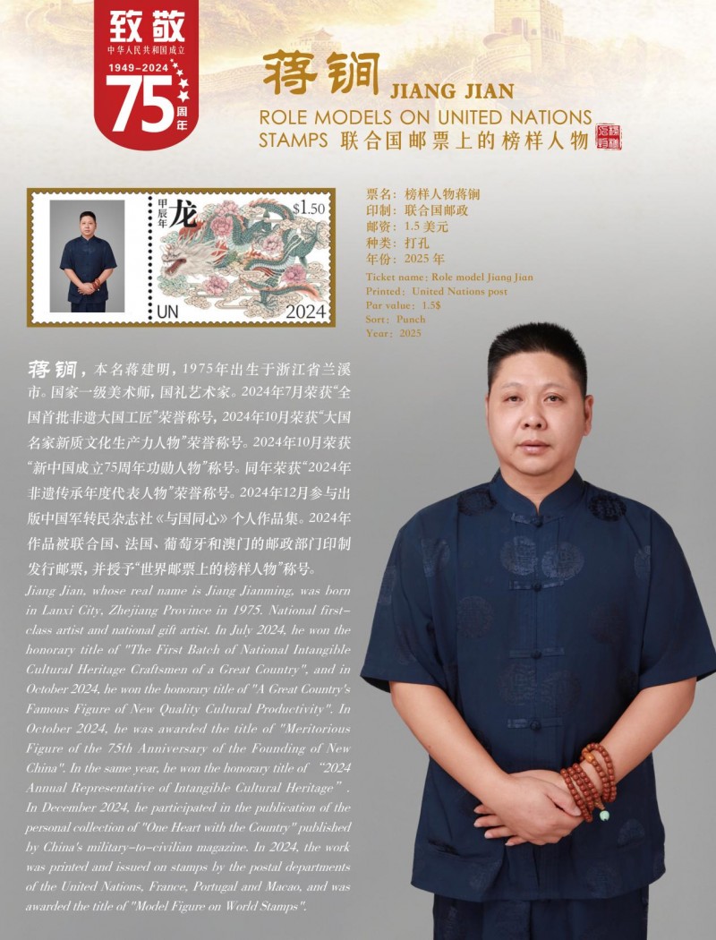 蒋锏,本名蒋建明,1975年出生于浙江省兰溪市。国家一级美术师,国礼艺术家。2024年7月荣获“全国首批非遗大国工匠”荣誉称号,2024年10月荣获“大国名家新质文化生产力人物”荣誉称号。2024年10月荣获“新中国成立75周年功勋人物”称号。同年荣获“2024年非遗传承年度代表人物”荣誉称号。2024年12月参与出版中国军转民杂志社《与国同心》个人作品集。2024年作品被联合国、法国、葡萄牙和澳门的邮政部门印制发行邮票,并授予“世界邮票上的榜样人物”称号。