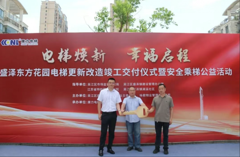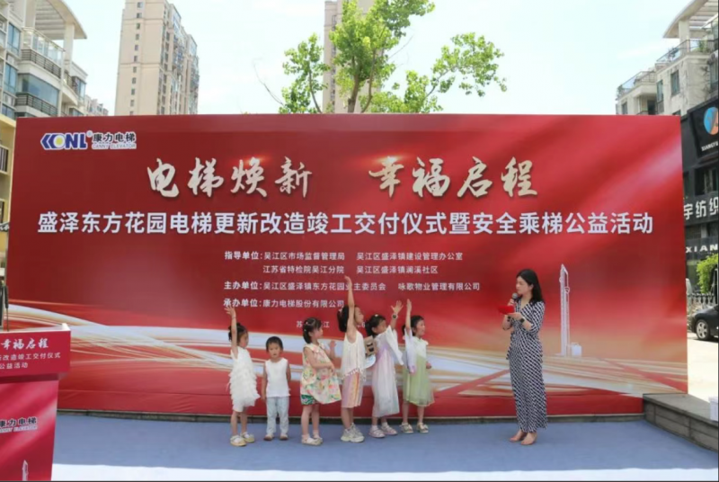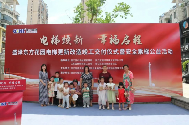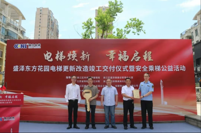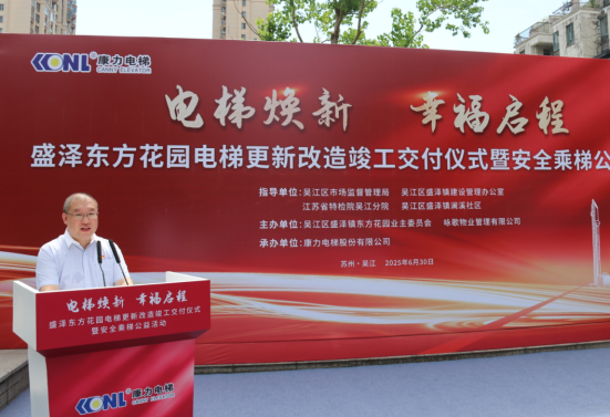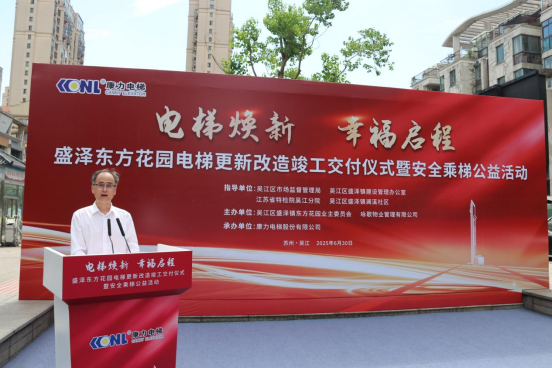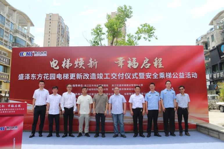 2025年6月30日,吴江区首批次国债支持老旧住宅电梯更新改造--盛泽东方花园29台电梯更新改造工程正式交付。吴江区市场监督管理局、吴江区盛泽镇建设管理办公室、江苏省特检院吴江分院、吴江区盛泽镇澜溪社区各级领导,东方花园业主代表、咏歌物业相关负责人、康力电梯相关负责人共计50余人,共同见证“电梯焕新·幸福启程”。