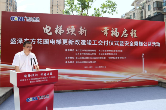 吴江区盛泽镇建设管理办公室王琦主任,代表党工委向项目顺利竣工交付表示热烈祝贺。盛泽镇紧紧抓住重大政策机遇,争取并落地国债资金项目,精准用于解决群众最急难愁盼的安全出行问题。始终坚持“以居民满意为标准”,各相关部门全力以赴,紧盯“快、稳、静”的换新目标,将一部部崭新、明亮、运行流畅的电梯,打造成为连接千家万户的“幸福通道”。