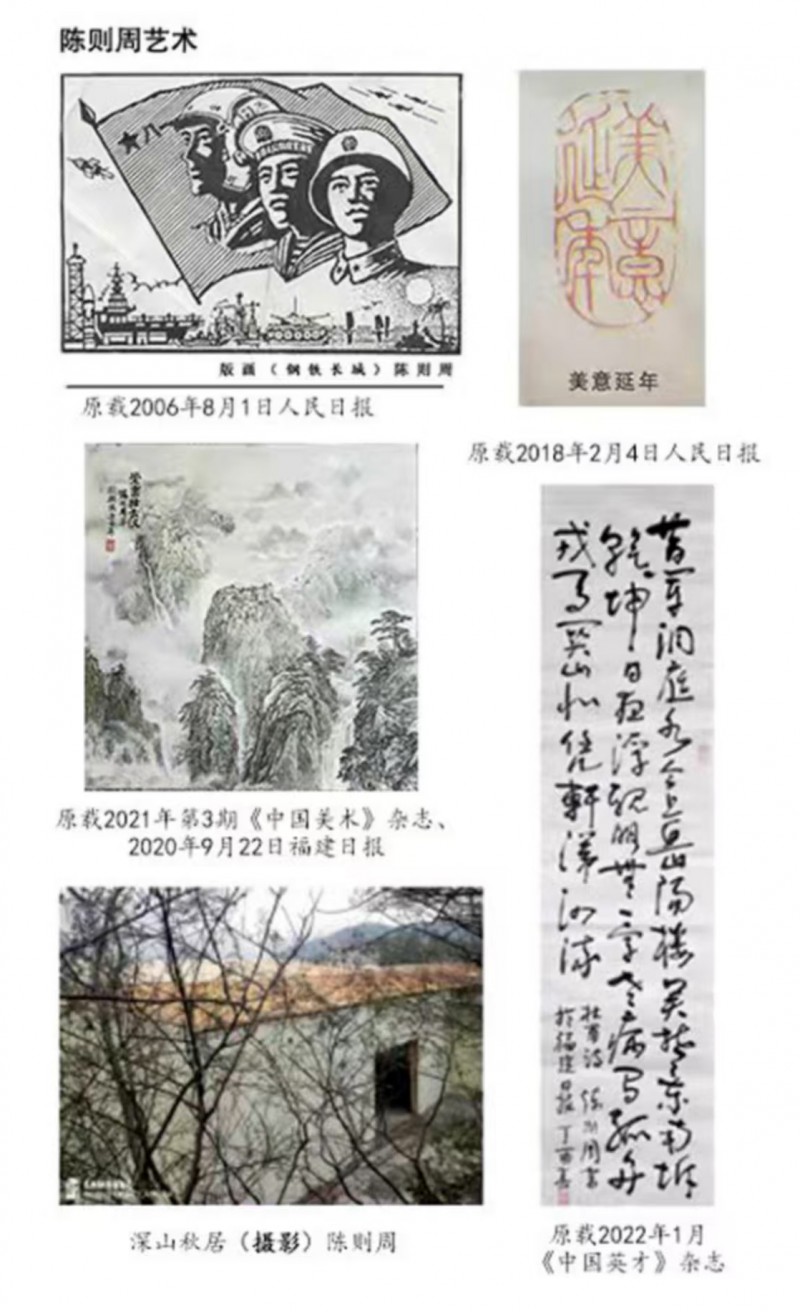 他走过全国所有30多个省市自治区并出访多个国家,善纳各地文化,视野广阔,博采众长推陈出新。福建日报社位于人文丰厚的福州市鼓楼区。他母亲李秀华故乡是福建省福清市,小时候他在这读过书,这里深厚文蕴熏陶着他。他告诉记者,其夫人来自千年古邑建州的福建省南平建瓯市,人民日报曾以《腹有诗书气自华一一记青年女作家张小丹》,报道她文如其人秀美文静。则周对这里作过不少报道和文艺作品。他小孩在读大学一年级艺术系,发表过书画作品和文学作品。丰富的阅历、战场的考验成难得的创作源泉。人民日报、新华社、解放军报、光明日报等一百多种报刊媒体刊登其诗歌、散文、小说、绘画、书法、篆刻、雕刻、歌曲、摄影、剪纸等七千多篇件。人民出版社、作家出版社、人民音乐出版社出版文学、书画、音乐、摄影等16本。这位著名音乐大师天赋异禀神通音乐,独创口琴绑二胡同时合奏,作词作曲演唱笛子二胡口琴六项并举,作品优秀且数量惊人,歌词一千多首、歌曲三百多首。为全国隆重纪念抗战胜利80周年,他发表出作词作曲并演唱演奏的5首《弘扬抗战精神》的歌曲。通常作曲家谱一首歌要几天或几个星期,而他只要50分钟,旋律悦耳曲调动听。高音低音长音唱得运转自如声情并茂,音域宽广能唱多种调。歌手通常一首歌要练唱好几天且录唱两三个小时,而他没练唱且录唱一首只约45钟左右。他演出不化妆顺其自然。歌词源自诗歌,他出版过4本诗集并在人民日报、解放军报、光明日报、福建日报等发表二千多首诗歌,既有现代诗也有古诗词,其中歌词较多。所以写歌词轻车熟路,流畅上口、韵律严谨、富有情感。此外也是画家,故歌词诗情画意感人。作词者极少像他是中国作协、音协双会员。