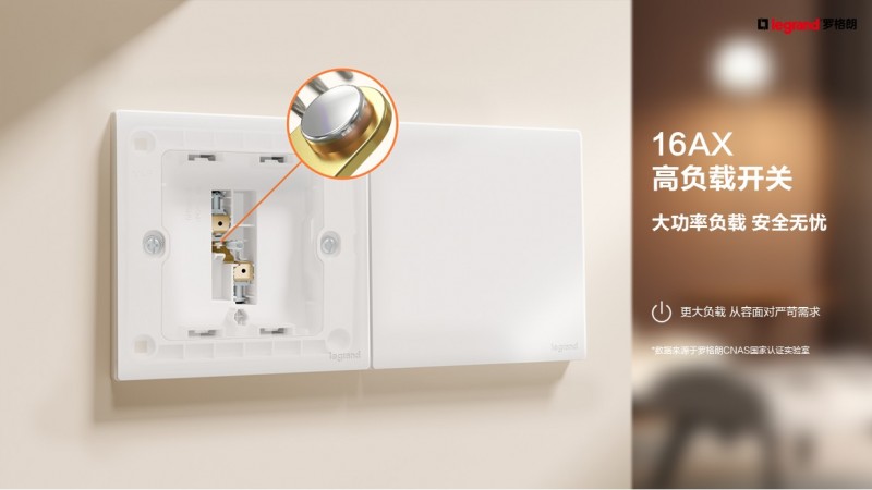 绮蕴系列延续了罗格朗品牌高品质的路线,开关选用优质pc料,磨砂质地,触感细腻,防指纹更方便日常打理;通过850°c 灼热丝测试,高阻燃更放心。绮蕴系列采用了加厚银合金触点、16a 高负载等配置保障用电安全;开关4 万次通断测试守护长期耐用基础,实力定义品质边界。