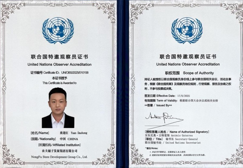 新闻行业垂直网站近日,联合国秘书处正式授予农夫铺子集团董事会主席兼ceo袁道红“联合国特邀观察员”证书,该证书由联合国秘书长安东尼奥·古特雷斯亲自授权签署。这一荣誉不仅是对袁道红个人在数字经济领域专业贡献的国际认可,更彰显了中国民营企业在全球数智化建设中日益提升的影响力,成为中国数字企业家参与全球治理的生动注脚。