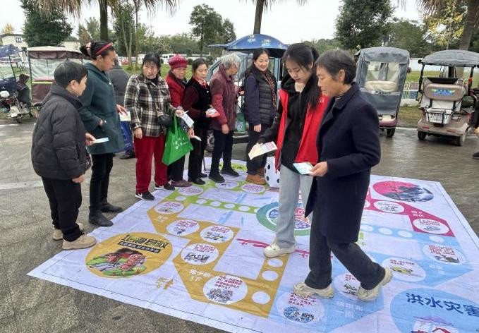 巨大的飞行棋棋盘铺展在地面上,棋盘格内设置了各类防灾减灾问题与情景模拟。居民通过投掷骰子前进,每至一格都需回答相应的安全知识问题,如“地震来时如何躲避?”、“厨房油锅起火怎么办?”,在一步步走向终点的过程中,居民进一步巩固了日常防灾要点。