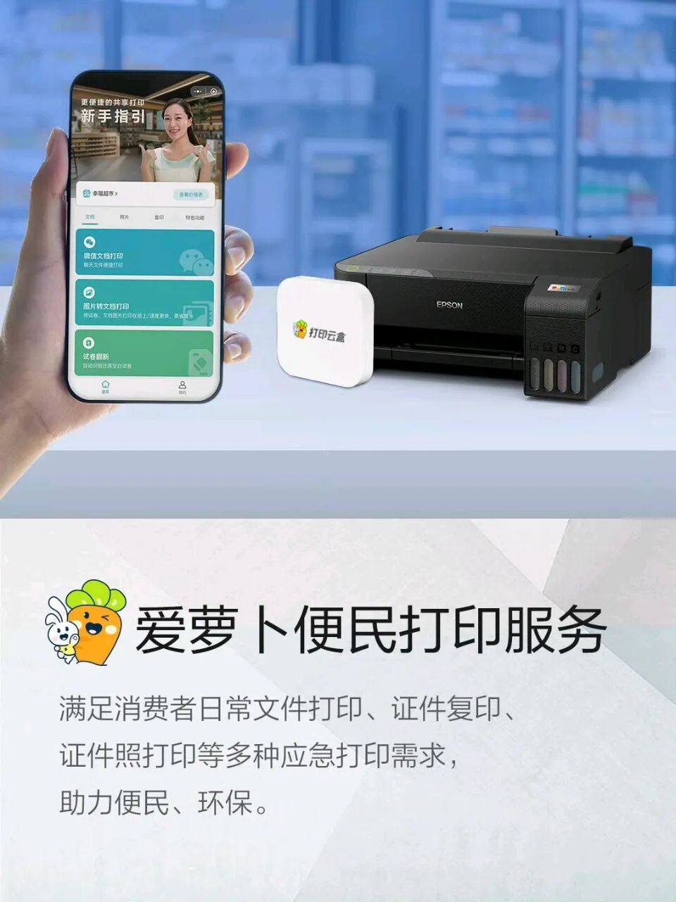 如面对中国共享经济的发展,爱普生推出了“爱萝卜便民打印”服务。据石桥响介介绍,该服务专门面向那些没有打印机购买需求,但又偶尔需要紧急打印的用户。“爱萝卜便民打印”在便利店、文具店、大型连锁门店、互联网闪电仓等地,提供覆盖用户社区的便捷凯发k8手机网页的解决方案。用户可以在家门口或附近通过手机轻松完成打印,满足微量的打印需求。