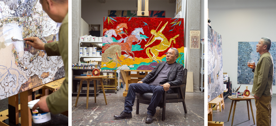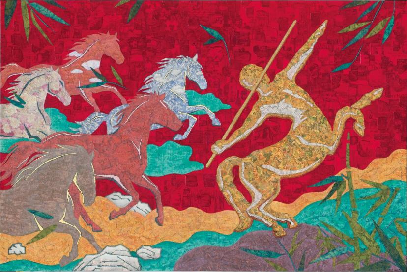 全新艺术臻品“邑马当先”整体画作凝练着中国文化的底蕴,寓意着一马当先、引领前行,传递出顺遂与繁盛的美好寓意。薛松运用其擅长的波普拼贴艺术手法,结合中式水墨画的风格,以探讨中西方艺术融合的角度切入创作,艺术家在长1.8米、宽1.2米的宽阔图景中,展现着半人马驭领新程之姿。