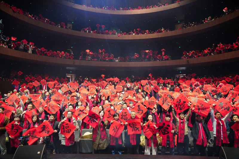 在充满年味的“送福”环节,一幅由八位陶瓷艺术家集体创作的《一马当先》瓷板画被隆重呈现,巍峨山峦映衬骏马奔腾,寄托着新年龙马精神的美好期盼。随之而来的“全场送福”更是将气氛推向高潮,千余名艺术家、嘉宾与观众共同举起手中书风各异的“福”字与“马”字,连缀成一片温暖跃动、文墨交融的红色海洋,“马上有福”的齐声祝愿响彻大厅,将新春的祝福与文化的温情深深传递到每个人心中。当《我和我的祖国》那熟悉而激昂的旋律在全场响起,所有人的情感与家国情怀深深共鸣,扎根于心。这场融合了多元艺术、贯穿着守护精神的陶瓷文化盛宴,在温情与展望中画上了圆满的句号,但文化的旅程永无止境。