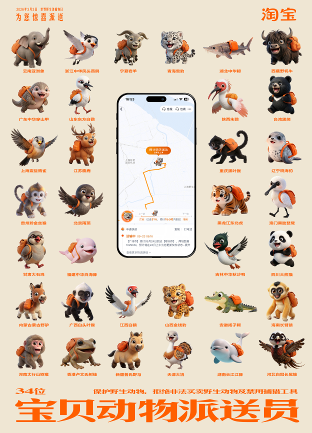 淘宝物流页上线34种“动物派送员”,你的快递可能由东北虎派送
